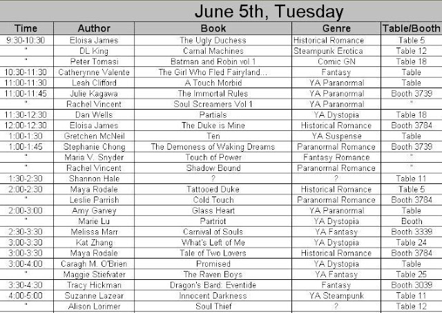 This kind of shocked me--I mean they put up what is more or less a good guide of autographing authors on the BEA website (which admittedly can be hard to navigate) and since I tend to obsessively pore over it I figured everyone else did too.